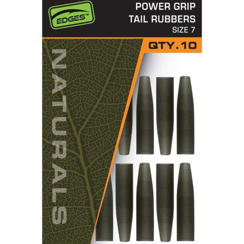 Fox Edges Naturals Power Grip Tail Rubbers са незаменими аксесоари при изработката на шаранджийски монтажи с загубено олово. Ролята им е ключова при изработването на монтажите, тъй като предотвратяват заплитането на влакното по време на риболов и осигуряват допълнителна защита на вирбелите. Цветът им предлага повишено камуфлажиране върху субстрата, в тинестите или плътно обрасли с растителност зони. Цялата гама аксесоари е изработена с изключително внимание и използваните материали са от високо качество.