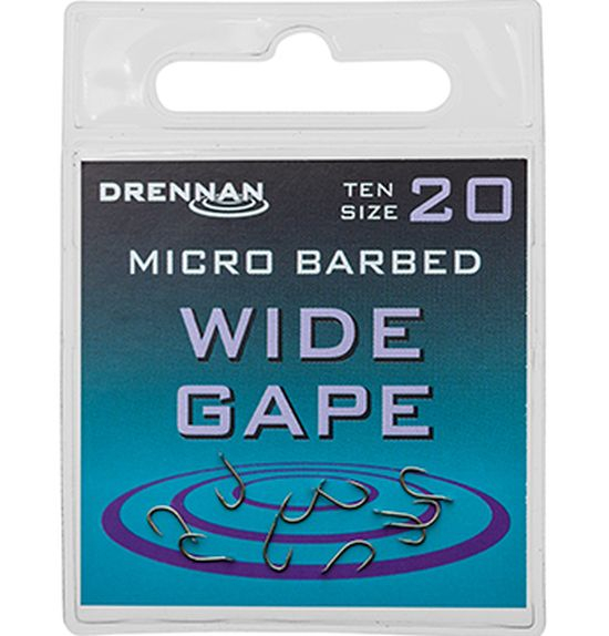 Drennan Wide Gape е класически куки без ухо, със средна дръжка, широко отваряне и изключително остър връх, предназначен за стационарен риболов на малки и средни по размер риби. Куките са изработени от стомана, имат отлична бронзова обработка и острието, създадено с специална технология, им осигурява дълъг живот. Този куки е идеален за риболов в райони с чакъл, по реки, езера или канали.