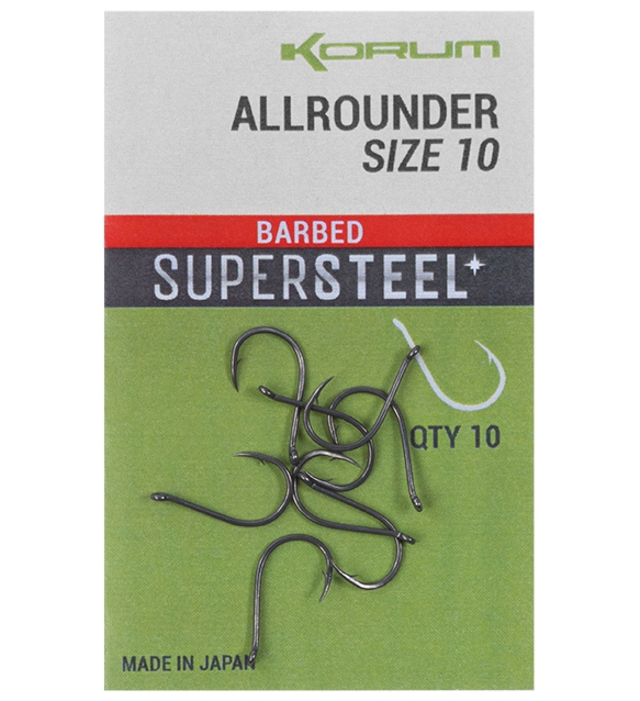 Korum Allrounder Supersteel е кука с ухо, ориентирано навън, средна и здрава дръжка, широк отвор и изключително остър връх, проектирана за улов на риби с размери среден клас. Куките са изработени от стомана, а острието с помощта на специална технология им дава дълготрайност. Тази кука е идеална за риболов в труднодостъпни райони и зони с чакъл.