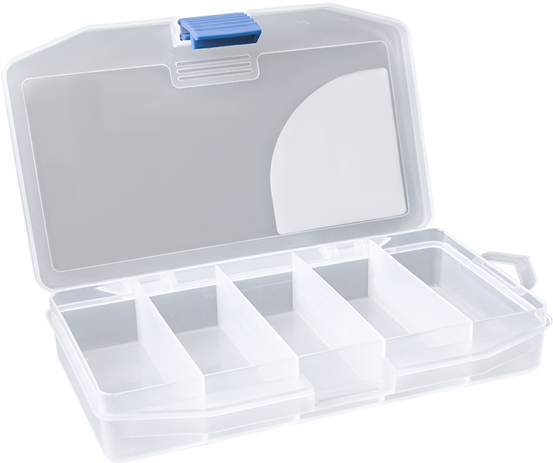 Истинска кутия за примамки. Разполага с 5 отделения, като ширината на всяко отделение е около 3 см. Кутията е прозрачна, за да могат да се виждат съхраняваните предмети. Изработена е от висококачествена пластмаса, с голям заключващ механизъм, който осигурява лесно отваряне и бърз достъп до съдържанието.