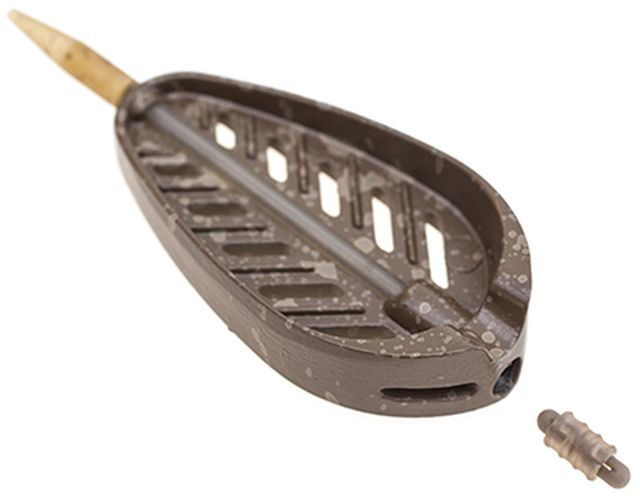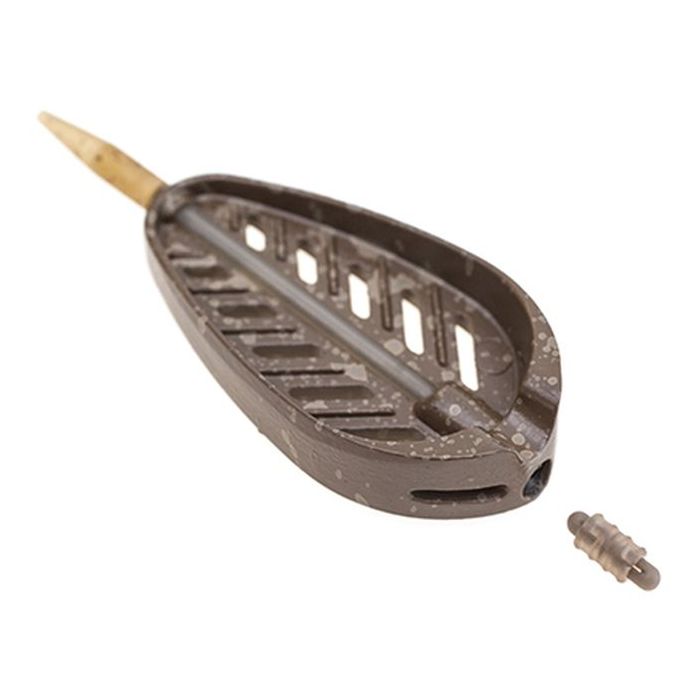 Аеродинамичният дизайн с теглото поставено отпред осигурява дълги и прецизни замятания. Щифтовата част на захранката е оборудвана с конусообразен гумен маншон, който помага за предотвратяване на заплитания. Освен това, на предния ръб на захранката има специална вдлъбнатина, позволяваща прибиране на повода навътре и скриване на куката в съдържанието на захранката, без риск от увреждане на влакното, независимо дали се използва плетено или монофилно влакно за повод.