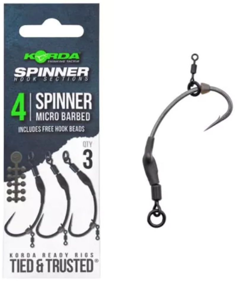 Korda Spinner Hook Sections е риг тип Spinner, създаден за улов на шаран. Процесът на използване в монтажа е изключително лесен: прикрепяте въртящия се вирбел с халка към флуорокарбоновия повод, връзвате примамка на куката и монтажът е готов за употреба. Материалите, използвани при изработката на тези ригове, са с високо качество, осигурявайки повишена здравина. Острият Spinner кукичка гарантира по-висок процент на засичане. Всички ригове Korda Spinner Hook Sections Micro Barbed включват въртящи се вирбели Spinner Swivel, Kicker, Micro Rig Swivel и Hook Bead. Риговете се доставят с 10 стопери за куки.