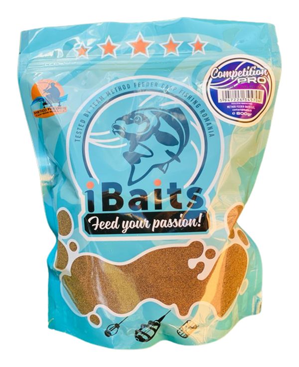 Competition Pro (цвят: тъмнокафяв, гранулация: средна, прилепване: отлично): Стръвта iBaits Competition Pro е специално разработена за атракция и задържане на рибите в зоната на подхранване; тя е създадена за използване в състезания и е успешно тествана в състезания по method фидер през последната година. Тази стръв е произведена с естествени висококачествени съставки като премиум рибни брашна, голямо количество халибутово брашно и аминокиселини, както и съставки, богати на животински протеини и мазнини, които осигуряват примамлива миризма и текстура за рибите. Освен това, iBaits Competition Pro съдържа смлени пелети с дребна гранулация, което я прави лесна за ползване, като се разпръсква равномерно във водата за привличане на рибите в риболовната зона. В заключение, iBaits Competition Pro е отличен избор както за състезателни риболовци, така и за любители, които искат да привлекат рибите и да ги задържат по-дълго време на мястото на риболов. Съставена от естествени висококачествени съставки, тя е идеална за риболов както в диви води, така и в интензивно населени езера.