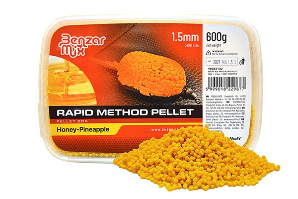 пелети Benzar Method Rapid са специално създадени за риболов на фидер, с фина гранулация от 1.5mm, идеални за използване в method фидер и захранващи кошнички. Тези пелети се отличават с бързо разпадане във вода, освобождавайки силни атрактанти, които привличат рибите към мястото за кратко време. Формулата им съдържа висококачествени протеини, рибни брашна и есенциални аминокиселини, осигурявайки висока хранителна стойност за рибите.