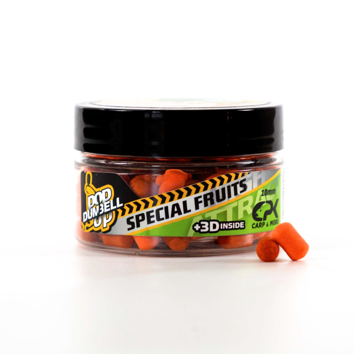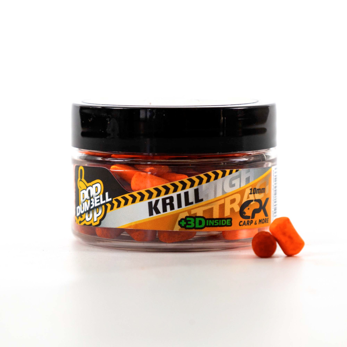 CPK 3D Dumbell са поп-ъпи с диаметър 10mm, които разпръскват около монтирането облак аромат и цвят, който привлича рибите на хлебната стръв. Разпръскването на облака се извършва както хоризонтално (на дъното), така и вертикално (в колона вода), увеличавайки шансовете за привличане на рибата в зоната на нахранването. Поп-ъпите имат цилиндрична форма и закръглени краища (дъмбел), което позволява лесно тяхното монтиране на повод, на силиконова лента, на бърз стоп или на примамка. Препоръчват се при риболов с фин rigs на фидер, като са характеризирани с ефективно разпръскване на аромата, дори и в студена вода.