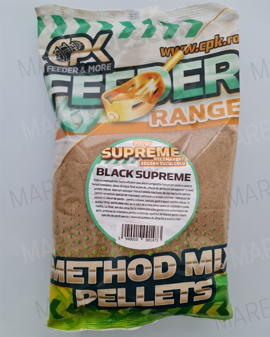 Black Supreme - Това е много ефективна method смес, която съдържа рибни брашна, зърнени култури и месо. Основната идея е "скорост на разпадане на дъното" и високо ниво на протеини. След това в сместа са добавени най-висококачествени смлени пеlete (чрез специален процес на смилане), обогатени с хранителни течности - хидролизат от сьомга и рибни масла, за цвят, текстура, вкус и хранителна добавка. Малките частици също имат ролята да създадат активност на дъното в района на захранването. Накрая, привлекателността е увеличена до максимум чрез добавяне на усилватели на вкус, аминокиселини и бетаин, които стимулират апетита за храна за всички мирни рибни видове.