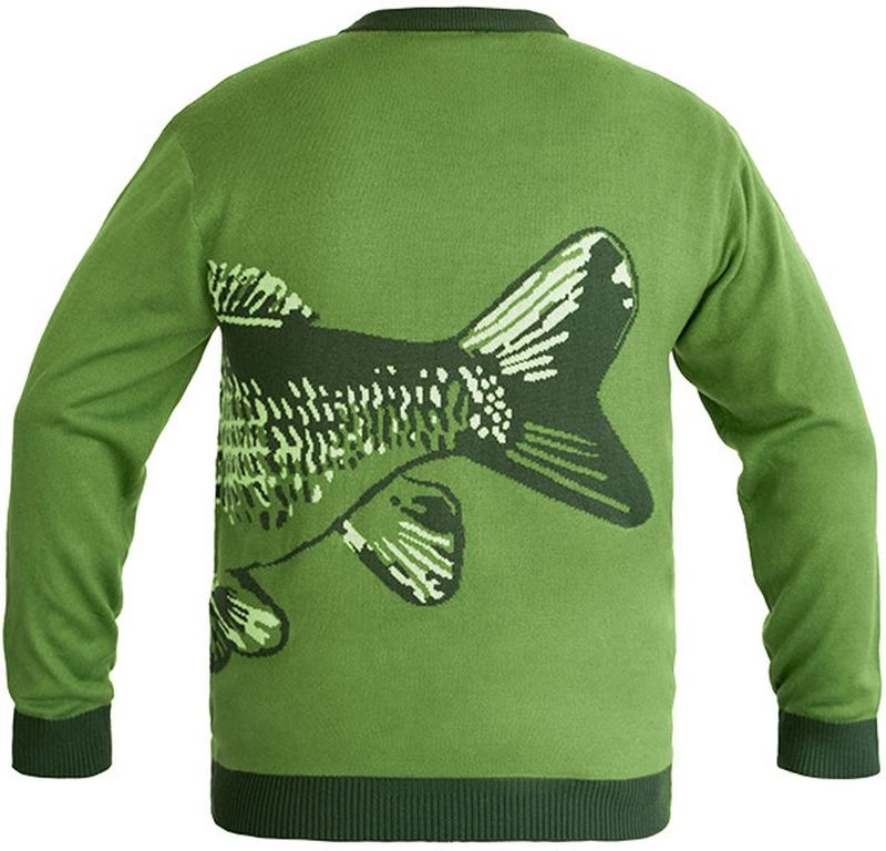 Този пуловер с шаранджийски мотив е създаден основно за любителите на риболова на шаран. Може да се носи по време на риболовни излети, но със сигурност е подходящ и за разходки в природата или в града. Пуловерът е изработен от топъл материал, който осигурява необходимата защита срещу студа. Предлага се в тъмнозелен цвят, а характерната му черта е голямата графика на шаран както отпред, така и отзад на пуловера.