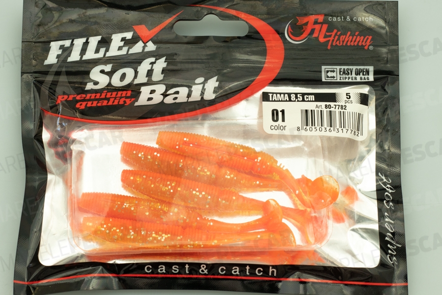 Tama - новият член на гамата меки примамки на Filex, съчетава всички най-добри характеристики на изключителна примамка с някои промени, за да ѝ придаде още повече вибрации. Със своето напълно набраздено тяло осигурява деликатна вълнообразна игра по време на прибиране, успявайки да размества по-голямо количество вода, което привлича повече удари. Оборудвана с голяма опашка за генериране на мощно плувно действие, на което костурът не може да устои. Перфектна за широк спектър приложения, това е феноменален избор за джиг риболов, но също така е смъртоносна примамка при риболов с монтаж Texas Rig. Поради пространството отзад може да се използва и с офсет куки в зоната с опасност от закачане.