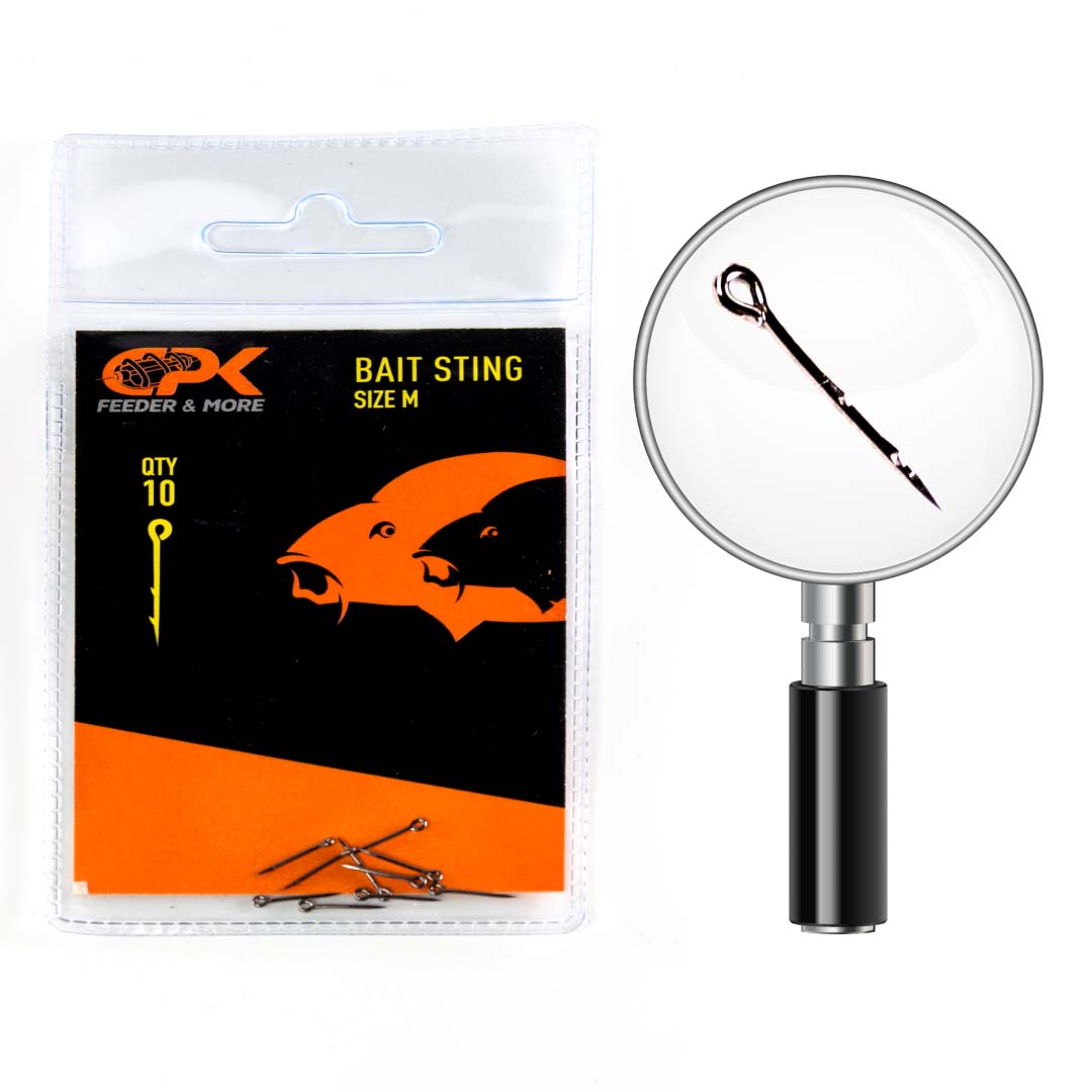 С помощта на спина можем за миг да прикрепим почти всяка стръв (пелети, бойли, царевица, поп-ъп) без да имаме нужда от бургия, кукичка или специални стопери. Bait sting е разработен за прикрепяне на меки стръвове към монтажи с косъм. Просто се поставя стръвта в този малък аксесоар и монтажът е готов. Малкият щифт върху тялото предотвратява освобождаването на стръвта, дори при далечно замятане.