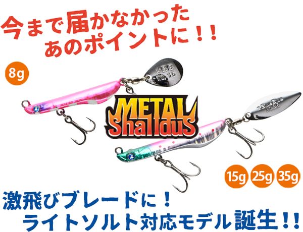 Metal Shalldus постига удивително летяло разстояние с център на тежестта, разположен в задната част. Естествено е, че това представяне при дълги хвърляния, дори срещу вятъра, е отлично при риболов от брега, като например лек джигинг. Освен това, компактното тяло и високата привлекателност на примамката ще бъдат много ефективни. Примамката до 15g има по-силно вълнообразно движение и устойчива съпротива при дърпане, което улеснява разбирането на състоянието на примамката. Допълнително, тежкият тип от 25-35g позволява лесно навиване с удобство. Metal Shalldus има забележително движение и обхват на дълбочина, който може да бъде перфектно контролиран с ножа.