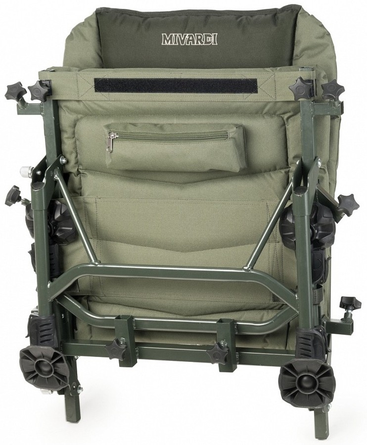 Този напълно иновативен стол е практически преосмислен от екипа на Mivardi, за да стане многофункционален, с изключителен комфорт благодарение на много високата облегалка. Разполага с нова и сложна система за поставяне на различни аксесоари. Опционалните адаптери могат да се закрепят в 8 гнезда, разположени по рамката на стола.