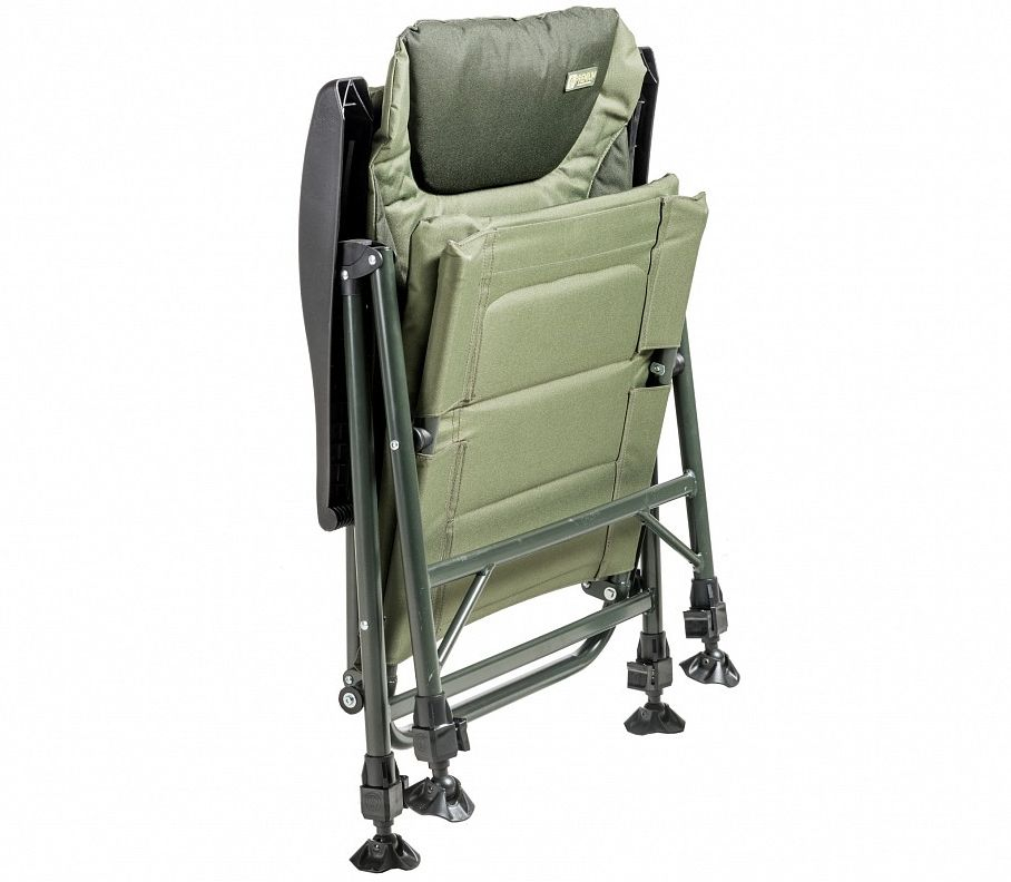 Регулируемите телескопични крака са снабдени с противохлъзгащи подложки, което позволява поставянето на стола на всякакъв неравен терен. Столът може да се сгъва за лесен транспорт. Седалката предлага удобна система за наклон на облегалката чрез плъзгане на подлакътниците. Подлакътниците се плъзгат лесно с помощта на иновативна система от износоустойчиви ролки. Като вдигнете подлакътниците, столът се сгъва напълно.