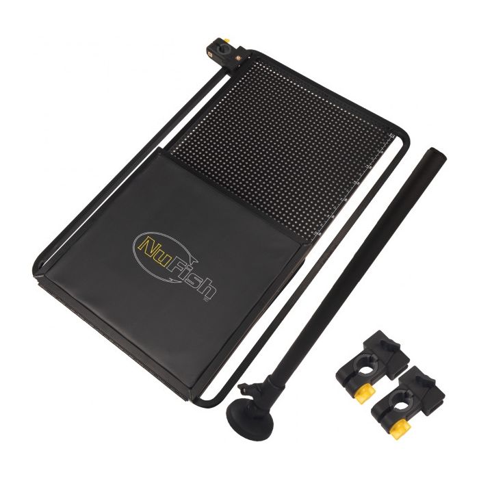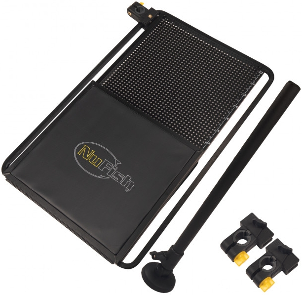 Страничната платформа е адаптивна за различни диаметри на краката благодарение на иновативната втулка. Изработена е от перфорирана ламарина, която не задържа вода при дъжд, може да поддържа аксесоари, кутии с примамки и др., необходими за риболовен излет. Платформата е съпроводена с кутийка за захранка с капак, осигуряващ добро съхранение на захранката по време на риболов. Благодарение на системата за закрепване платформата NuFish Aqualock Combi Side Tray може да се използва както отдясно, така и отляво. За добра стабилност и опора, платформата се доставя с телескопичен крак.