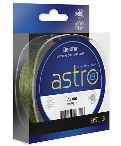 Delphin ASTRO 8 е плетен текстилен шнур от гамата на производителя Delphin, с кръгъл профил и гладка структура, калибриран точно по цялата дължина. Изработен от 8 много стегнато оплетени PE влакна (предотвратяващ заплитането на шнура) с микро покритие (намаляващо значително риска от образуване на възли при замятане), шнурът плъзга равномерно през водачите на въдицата, подпомагайки постигането на значителна дистанция при замятане.