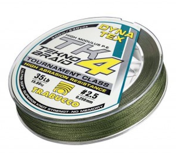 Повърхностната обработка подобрява перфектното плъзгане по водачите, намалявайки триенето и по този начин риска от загуба на улов е сведена до минимум. Dyna-Tex TK4 Tekno Braid носи подписа на прочутия италиански производител Trabucco, като влакната са подложени на иновативни производствени процеси, използващи японски технологии, които повишават тяхната устойчивост във времето и подобряват механичните им характеристики. Въпреки че в състава са използвани само 4 влакна, компактен начин на плетене осигурява висока плътност и кръгъл профил, характеристики, които подобряват каста и чувствителността.