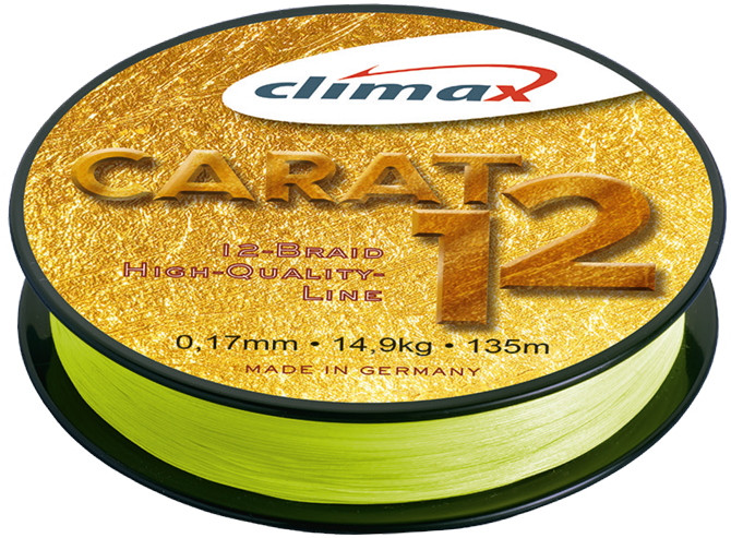 Climax Carat 12 е плетено влакно, изработено с помощта на SPIRAL технологията от серията на производителя Climax, с кръгъл профил и гладка структура, прецизно калибрирано по цялата дължина. Изработено от 12 много плътно плетени влакна (предпазва от заплитане), с микропокритие (значително намалява риска от образуване на възли при замятане), влакното се плъзга равномерно през водачите на въдицата, позволявайки постигането на сериозни дистанции при замятане.
