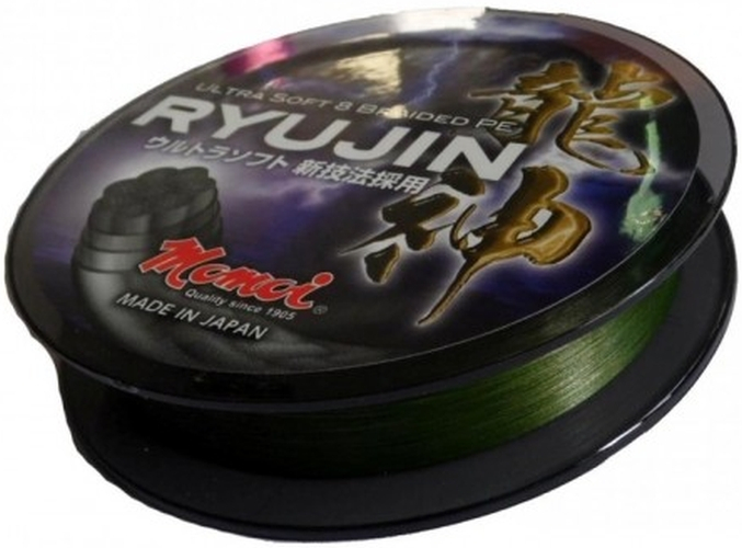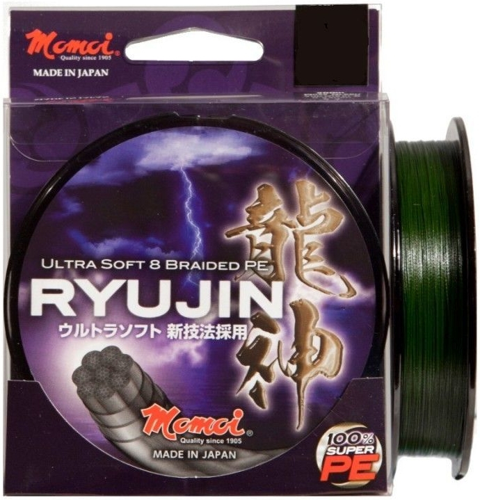 Momoi Ryujin PE Braided е плетен текстилен шнур. Изработен е от 8 нишки Super PE, много плътно оплетени (предотвратяващ влакнестото сцепване на влакното), с резултат „супер-окръглен“ профил, който се плъзга гладко през ринговете на водачите, повишена устойчивост на абразия и нулево разтегляне (което позволява значителна дистанция на замятане) благодарение на технологията Special Soft Processing (MJS Processing). Специалният състав на влакното не абсорбира вода, предотвратявайки по този начин утежняване на линията и намаляване на дистанцията на замятане. Здравата му структура също така предотвратява традиционното сплескване на линията. Тъмнозелен цвят помага за камуфлаж, като влакното е идеално за всякакви светлинни условия.