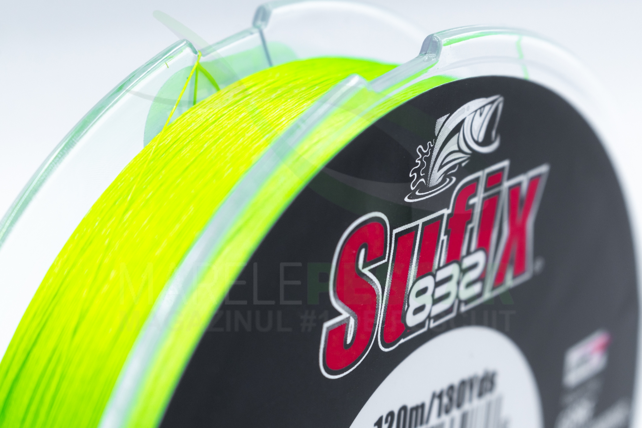 Sufix 832 Superline е един от най-здравите плетени шнурове на пазара, с изключителна здравина и в същото време намален диаметър. Изграден от 8 влакна (7 влакна Dyneema + 1 нишка Gore Performance) с около 32 тъканя/см, Sufix 832 се отличава и с следните характеристики: влакна, произведени с най-съвременна технология, постоянен диаметър, устойчивост на абразия, нулево удължение (което позволява значително разстояние на замятане).