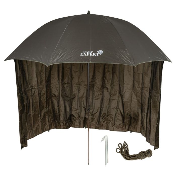 Чадърът за риболов с преграда от Carp Expert има диаметър 2.50 метра и е изработен от 100% полиестер. Материалът, от който е направен, е много лек, водоустойчив, устойчив на UV лъчи, а кракът е изключително здрав и изработен от дуралуминий. Ръбовете са снабдени с цип, който помага за закрепването на материала, който предпазва рибаря от вятър и дъжд. Тази преграда е оборудвана и с комплект колчета за стабилно закрепване в почвата.