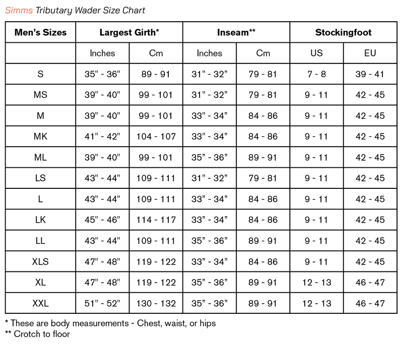 Tributary Stockingfoot е водоустойчив гащеризон от гамата на производителя Simms, резултат от 16000 часа теренни тестове. Гащеризонът е конструиран с издръжлива, дишаща полиестерна тъкан с четири слоя в долната част и три слоя в горната. Неопреновите ботуши са формовани чрез компресия за повишен комфорт и по-добро прилепване. В областта на гърдите има 3 джоба – едни централен с водоустойчив цип и два странични, подплатени отвътре с микрофлийс за затопляне на ръцете. Като система за закопчаване, гащеризонът разполага с две регулируеми презрамки и еластичен колан около талията.